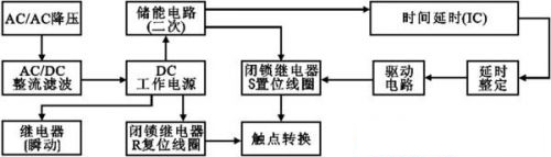 斷電延時繼電器整體構成包括斷電延時繼電器電源部分(經降壓、整流、濾波)以提供斷電延時繼電器內置瞬動電磁繼電器和2繞組閉鎖型R復位線圈工作);二次電源部分(供斷電后延時部分與2繞組閉鎖型S置位線圈工作);延時工作部分(可編程定時集成或CMOS計數分頻集成);驅動部分;執行繼電器部分組成(圖1)。