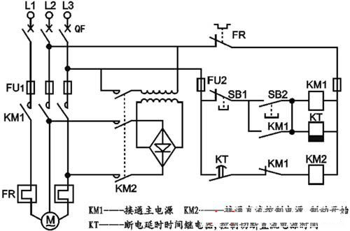 制動過程:按下停止按鈕SB1→KM1斷電,KM1主觸點斷開,電機脫離電源,KM1輔助常閉觸點恢復閉合,KM2通電,接入直流電源,制動開始,同時KM1輔助常開觸點又恢復斷開,則KT線圈呈斷電狀態,延時開始,待所設延時時間到達后,KT的延時斷開常開觸點恢復斷開,KM2失電,切斷直流電源,制動結束。