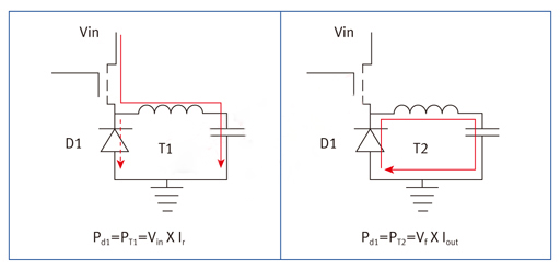 T1期間,D1處于阻斷狀態(tài)。唯一的電流是反向電流。此電流相對(duì)較弱,并且主要由阻斷電壓或輸入電壓Vin決定。T1階段二極管產(chǎn)生的功耗,稱為PT1,大致等于Ir*Vin。