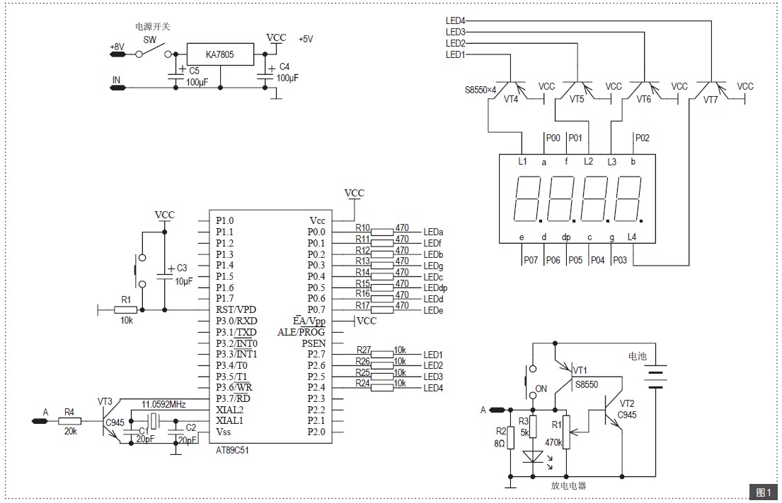程序設(shè)計(jì)是以單片機(jī)P37口作為計(jì)時(shí)控制端子,P37口輸入低電平,計(jì)時(shí)程序啟動(dòng),4只數(shù)碼管顯示時(shí)間。放電電路中按下啟動(dòng)按鍵,放電過(guò)程觸發(fā),VT1導(dǎo)通,電池端電壓降落到放電電阻R2兩端,A端對(duì)地為高電平,通過(guò)電阻R4迫使三極管VT3導(dǎo)通,P37口電平就被拉低了,單片機(jī)計(jì)時(shí)程序啟動(dòng)。電池電壓降到終止電壓以后,放電電路自動(dòng)關(guān)閉,A端電壓消失,VT3恢復(fù)截止?fàn)顟B(tài),計(jì)時(shí)程序停止,數(shù)碼管維持顯示當(dāng)前持續(xù)時(shí)間。