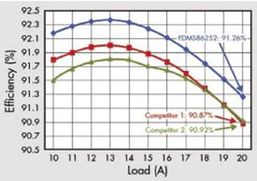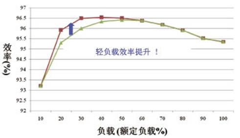 針對于服務器應用和通信應用的高性能電源,在設計過程中有以下三個指標尤為重要:一、如何提高系統的功率密度,二、如何提高系統輕載下的效率,三、如何實現長系統壽命下的高可靠性。圖片所示是在原系統基礎上改用飛兆半導體中等電壓Power Trench MOSFET后在輕載25%狀態下效率有明顯的提高,大約1%左右。