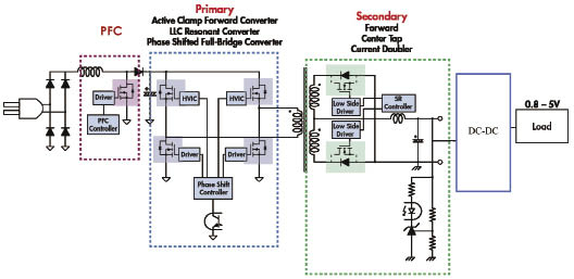 這里我們首先以AC-DC同步整流應用為例。在通訊電源的應用中它的主功率部分主要由功率校正電路、原邊的電源轉換電路、副邊的整流電路組成,我們可以很清楚的看到,在圖中有非常多的功率器件,系統的效率也就由這些功率器件的工作效率以及本身的性能優劣決定。