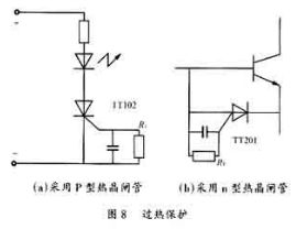 采用溫度繼電器來檢測電源裝置內(nèi)部的溫度,當電源裝置內(nèi)部產(chǎn)生過熱時,溫度繼電器就動作,使整機告警電路處于告警狀態(tài),實現(xiàn)對電源的過熱保護。亦可將溫度繼電器置于開關(guān)三極管的附近,一般大功率管允許的最高管殼溫度是75℃,調(diào)節(jié)溫度整定值為60℃。當管殼溫度超過允許值后繼電器就切斷電器,對開關(guān)管進行保護。半導(dǎo)體熱敏開關(guān)器件“熱晶閘管”在超溫保護方面有重要作用。它可以用作溫度指示電路。根據(jù)p型控制柵熱晶閘管(TT102)的特性,由RT值確定該器件的導(dǎo)通溫度,RT越大,導(dǎo)通溫度越低。當將其放置功率開關(guān)三極管附近,或在電源裝置內(nèi)時,它就能起到溫度指示作用。當功率管的管殼溫度或者裝置內(nèi)部的溫度超過允許值時,熱晶閘管就導(dǎo)通,使發(fā)光二極管發(fā)亮告警。倘若配合光電耦合器,就可使整機告警電路動作,保護開關(guān)穩(wěn)壓器。它亦可以象圖8(b)那樣用作功率晶體管的過熱保護,晶體開關(guān)管的基極電流被n控制柵型熱晶閘管TT201旁路,開關(guān)管截止,切斷集電極電流,防止過熱。