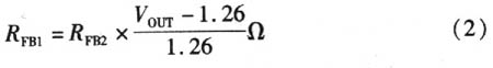 輸出電壓是依據反饋引腳和連接到輸出端的電阻分壓器設計的,如圖3所示。反饋引腳的電壓是1.26 V,因此根據式(2),由反饋電阻比來設計輸出電壓: