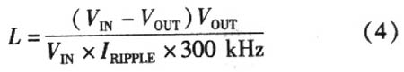 電感的關鍵參數是電感系數、峰值電流和直流阻抗。電感系數與電感波紋電流峰-峰值、輸入電壓以及輸出電壓有關(工作頻率是300kHz)。即: