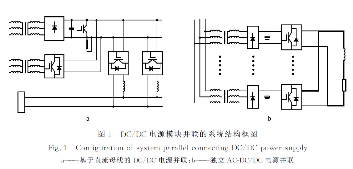 采用圖1a所示的拓撲結構,系統(tǒng)需大容量不可調直流電源,一般可采用整流變壓器降壓,二極管整流并經電容濾波得到。這種結構雖可保證并聯(lián)的每條支路有共同的直流電壓輸入,避免并聯(lián)支路因直流側輸入電壓不同而帶來的不均衡,但該直流電源的容量大,電流達20KA,直流母線承受的負荷過重,前級AC-DC設備要求較高,不易實現(xiàn)。另外,輸入端共用母線不利于實現(xiàn)完全意義上的獨立電源模塊的并聯(lián)。因此,采用如圖1b所示的AC-DC/DC直流電源并聯(lián)的拓撲結構。