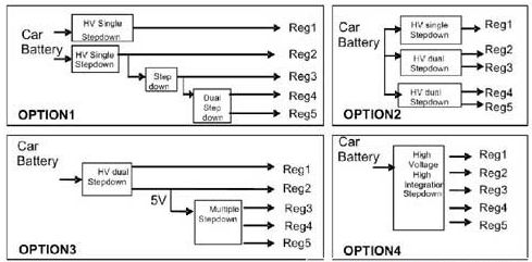 這里列出了四種常用的電源架構(gòu),總結(jié)了最近三年汽車(chē)領(lǐng)域的典型設(shè)計(jì)架構(gòu)。當(dāng)然,用戶可以通過(guò)不同方式實(shí)現(xiàn)具體的設(shè)計(jì)要求,多數(shù)方案可歸納為這四種結(jié)構(gòu)中的一種。