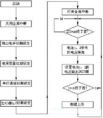 為了驗證本文的均衡充電方法,以兩節單體電池組成的蓄電池組為例進行實驗和分析,主要驗證旁路中開關管對電壓的調節作用。控制流程見圖4。