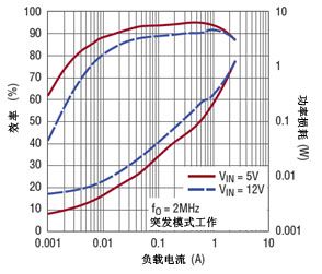 圖 4:突發(fā)模式工作在輕負載時產(chǎn)生高效率,而低 RDS(ON) 開關在最大負載時保持高效率