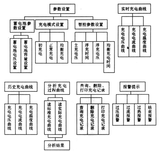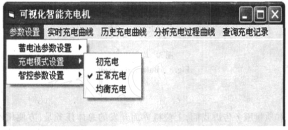 在參數(shù)設(shè)置中可以對框圖中所示的條目進(jìn)行設(shè)置,使得該系統(tǒng)具有很強(qiáng)的通用性。電動車電池一般由幾個單體組合而成,可以選擇單體個數(shù)以確定電池組的電壓和容量。該系統(tǒng)提供了如框圖所示的三種充電模式,一般新電池前五次充電要進(jìn)行初充電以充分激活電解質(zhì),當(dāng)單體電量不同時要均衡充電,其余時正常充電。還可以按照需求設(shè)置不同充電階段的充電時間,來滿足各種電池的不同需求;實(shí)時充電曲線實(shí)時地顯示充電電流、電壓和電池溫度;歷史充電曲線可以顯示該電池組充電歷史;通過分析充電過程曲線即可了解電池存在的問題,如:蓄電池缺乏電解液、電解液比重不符合要求或蓄電池單體存在差異等,從而及時的對電池進(jìn)行保養(yǎng);該系統(tǒng)還提供了按日期或電池編號查詢、刪除充電記錄的數(shù)據(jù)庫功能,方便了操作;報(bào)警提示用來告知用戶充電的過壓、過流、過熱情況以及充電是否結(jié)束。
