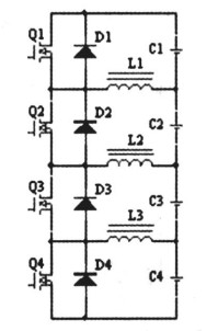 在均衡電路中,以4節(jié)電池為例,當(dāng)對第二節(jié)電池均衡時,開啟MOS管Q2,蓄電池C2通過Q2給電感L1、L2充電,然后關(guān)斷MOS管Q2,則電感L1中的電流通過二極管D1回饋給蓄電池C1,電感L2中的電流通過二極管D3和D4回饋給蓄電池C3和C4,以達(dá)到各個單體均衡的效果。