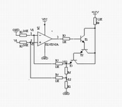 顯示模塊主要實現(xiàn)的功能是顯示設置的電流輸出值和其它人機交互信息。本部分可以采用七段數(shù)碼LED顯示器,顯示數(shù)字、簡單字母和小數(shù)點等信息,但由于其顯示信息單一,人機交互不友好,本文采用字符型液晶顯示屏LCDSMC1602A模塊。該模塊具有輕薄短小、低壓微功耗、體積小、無輻射、平面直角顯示及影像穩(wěn)定不閃爍等優(yōu)點,且可視面積大、面效果好、分辨率高、抗干擾能力強,適合用于顯示字母、數(shù)字、符號等信息,而且不需要擴展過多外圍電路,可由單片機直接進行控制輸出顯示。電壓-電流轉換模塊由精密運放與三個晶體管組成的達林頓管電路構成。轉換電路利用晶體管平坦的輸出特性和深度負反饋電路使輸出電流穩(wěn)定,如圖2所示,此V/I轉換電路的帶負載能力強,電流輸出范圍達0~3A。輸出電流Io經反饋電阻Rf得到一個反饋電壓Vf,Vf= V11-V12,通過R5、R6加到運算放大器的兩輸入端,設運放兩端的電為V1、V2,Vi由單片機DAC輸出。因為理想運放的輸入電流約等于零,且 V1=V2,則: