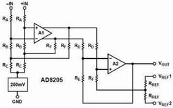 AD8205的內部電路由A1和A2兩個集成運放和一個電阻網絡,以及一個小參考電壓源和偏置電路構成,其電路結構如圖1所示。
