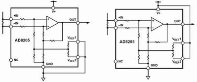 雙極性輸出時AD8205可以測量流過采樣電阻上的雙向電流,這時,輸出可以偏置到輸出范圍內的任意位置。當被檢測的正反兩個方向上的電流為等幅時,其輸出必須偏置到滿量程輸出的中間位置。當雙向電流幅值不對稱時,輸出偏置可以對應地偏離半量程位置。它的兩個參考輸入VREF1和VREF2分別連接一個內部電阻RREF后接到同一個內部偏置節點,這兩個參考輸入端的操作方式完全相同。在兩個參考電壓輸入端接入對應的電壓,即可完成對輸出的偏置。在雙極性輸出方式下,一般有以下兩種連接方式。