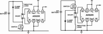如圖4(b)所示連接,PWM開關和采樣電阻都位于電壓高側。當PWM開關打開時,負載電源將被移除,但仍然可以提供和監測續流電流,以實現電流控制診斷。在工作過程中,大部分時間電源都和負載隔離,這樣可將負載對地之間的差分電壓所引起的不良影響減到最小。當PWM開關閉合時,電源電壓將連接到負載,這時共模電壓將增加到電源電壓。而PWM開關打開時,電壓將反轉并經過感性負載,由于續流二極管的作用,使得采樣電阻上的共模電壓保持為一個低于地的二極管的導通壓降。