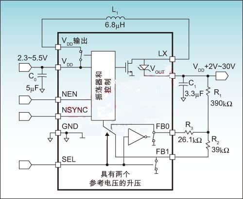 典型的反饋電壓是1.15V±2%。當選擇引腳(SEL)設置為低時,F(xiàn)B0反饋引腳就與參考電壓進行比較,F(xiàn)B1引腳接地,用以提供反饋參考地。當SEL為高時,F(xiàn)B1用作參考電壓,F(xiàn)B0接地。輸出電壓可用公式5和公式6計算: