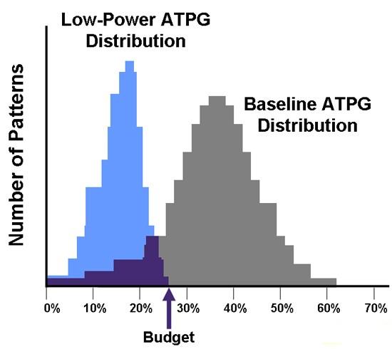然而,如果我們采用相關技術降低測試期間的功耗,我們就能有效地將這種分布向左移。在圖1中重疊的藍色低功率分布區,掃描ATPG向量的峰值開關活動沒有超過功率預算,因此降低了制造測試中功率問題產生的風險。
