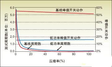 圖4:測試周期數和峰值開關動作與壓縮率之間的關系。