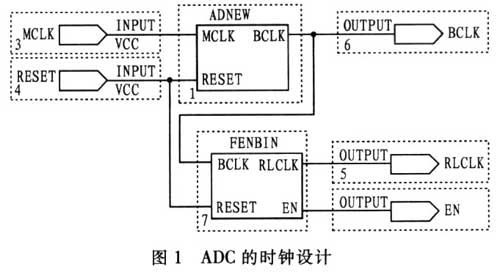 圖1示出A/D轉換器的輸入時鐘設計,MD轉換器工作在從模式下時,需要外部提供RLCLK和BCLK。在主時鐘MCLK的輸入下,通過對MCLK 4分頻得到BCLK的信號,用來作為位數(shù)據(jù)提取的信號。RLCLK是通過對BCLK的32分頻得到的,用來區(qū)分左右通道的數(shù)據(jù),同時輸出EN信號作為后續(xù)處理的同步信號。