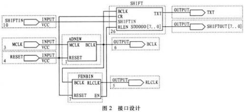 在圖2中,輸入為MCLK(主時鐘)、RESET(啟動信號)和SHIFTIN(A/D輸出數(shù)據(jù)),輸出為RL(左右?guī)盘?、BCLK(A/D數(shù)據(jù)位時鐘),TXT(并行數(shù)據(jù)讀取控制)和SHIFTOUT(并行數(shù)據(jù)輸出)。通過時鐘控制輸出BCLK和 RLCLK到AD1871,AD1871傳出數(shù)據(jù)SHIFTIN進入SHIFT模塊,SHIFT模塊在正確的位時鐘下讀取SHIFTIN的輸入數(shù)據(jù),并進行串,并轉換,之后輸出8位或12位的數(shù)據(jù)。同時輸出TXT并行數(shù)據(jù)讀取控制。