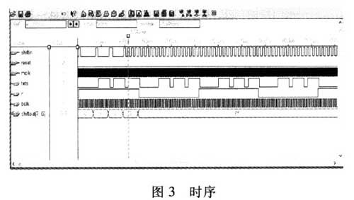 筆者用MaxPlus II對以上設計進行仿真后得到圖3所示的時序圖,完全滿足設計要求,從圖3可以看出串行輸入的數(shù)據(jù)(shiflin)變成并行的數(shù)據(jù)(shiftout) 輸出,在此過程中數(shù)據(jù)延時8個周期,每個txts的上升沿提取數(shù)據(jù)能保證數(shù)據(jù)的正確性。因為從數(shù)據(jù)的變動到txts的上升沿有400ns,大于FPGA的數(shù)據(jù)建立時間(25ns~50ns),可以保證提取數(shù)據(jù)的正確性。