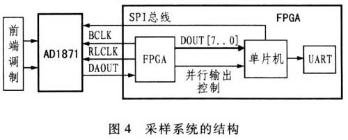 圖4示出采用ADl871構成的采樣系統(tǒng)結構。整個系統(tǒng)在1個FPGA上實現(xiàn),分為3部分:并轉換模塊;ADC控制和配置;UART通信。
