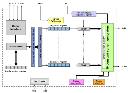 這款產(chǎn)品是一個(gè)16通道LED驅(qū)動(dòng)器,內(nèi)置一個(gè)高頻串行數(shù)據(jù)接口。每路通道的最大輸出電流為60mA,可以通過(guò)一個(gè)外部電阻器調(diào)節(jié)輸出電流,使用一個(gè)8位增益寄存器可以精確調(diào)節(jié)256級(jí)灰度。