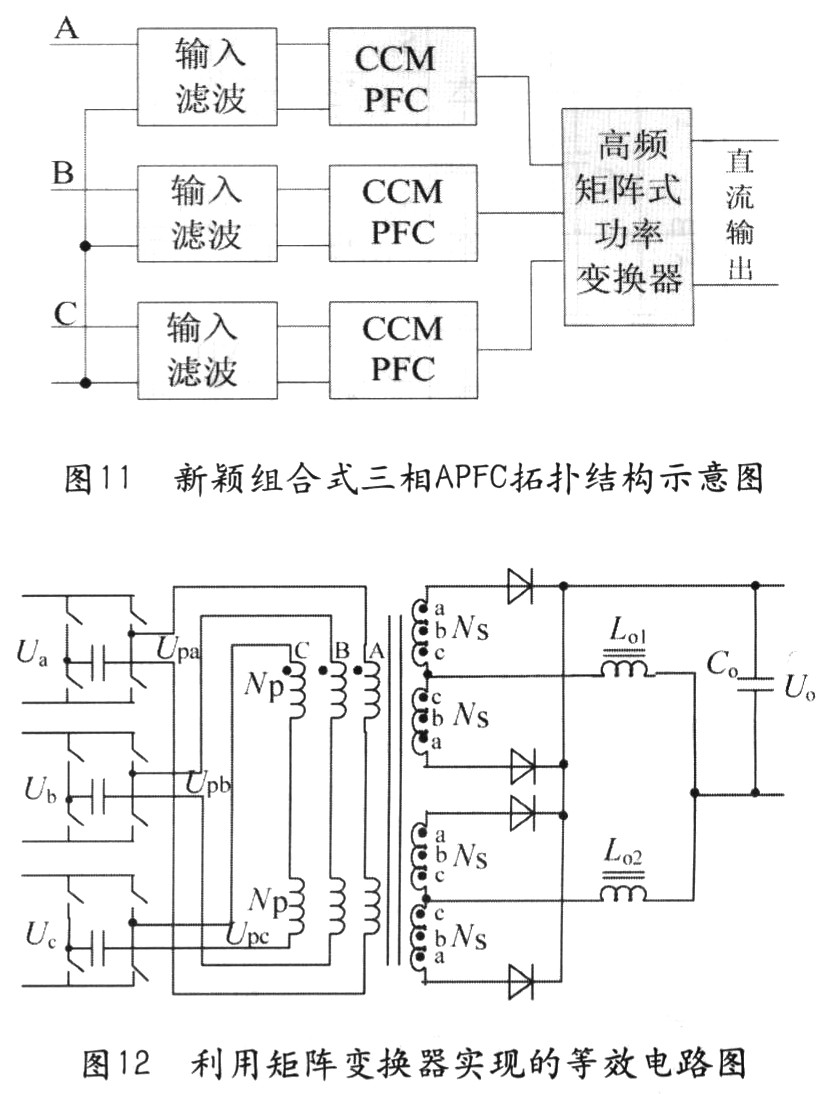 三個單相PFC經(jīng)逆變后的交變電壓相位、頻率、幅值相同,通過三相矩陣高頻變壓器的耦合、變壓及隔離,輸出所需要的直流電壓。三個單相PFC獨立性比較強,輸出之間相互電氣隔離,解決了三個單相PFC之間相互影響的圖12利用矩陣變換器實現(xiàn)的等效電路圖這一技術(shù)難題。