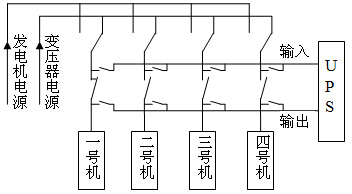 本系統(tǒng)設(shè)計(jì)利用美國(guó)山特公司3C3 UPS的特性,該UPS有一個(gè)內(nèi)部電子旁路檢修開關(guān),UPS在關(guān)機(jī)狀態(tài)下,電源是通過UPS內(nèi)部電子旁路直接輸出供電。外部再加一個(gè)旁路開關(guān)(圖1),外部旁路開關(guān)與內(nèi)部電子旁路開關(guān)形成并聯(lián)。UPS加入供電系統(tǒng)時(shí), UPS必須在關(guān)機(jī)狀態(tài)下,接通UPS輸入輸出端開關(guān),UPS與外部旁路開關(guān)形成并聯(lián)接通,然后斷開外部旁路開關(guān),再將UPS開機(jī)。UPS退出供電系統(tǒng)時(shí),必須先將UPS關(guān)機(jī),接通外部旁路開關(guān)(若UPS未在關(guān)機(jī)狀態(tài)下,相當(dāng)于UPS在開機(jī)時(shí)輸出端加入反向電壓,UPS可能燒毀),斷開UPS輸入輸出端開關(guān), UPS退出供電系統(tǒng)。這樣就很容易做到將UPS加入和退出供電系統(tǒng)中。