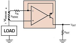 為了克服這些電流檢測難題,人們創造了高端電流檢測放大器。這些特殊放大器用來從高共模電壓中抽取通過小檢測電阻的電流產生的小差分電壓。然后,檢測電壓被放大并被轉換成以地為基準的信號。圖 5 顯示了高端電流檢測放大器的基本拓撲。在這個圖中,放大器給 RIN 加上等于 VSENSE 的電壓。然后,通過 RIN 的電流流過 ROUT,提供以地為基準的輸出電壓。就這個基本功能而言,很明顯,高端電流檢測放大器應該有高輸入阻抗、高增益和高增益準確度、以及寬共模范圍和良好的共模抑制。也許不那么明顯的是還有放大器精確度的重要性。