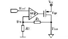 間接閉環(huán)控制環(huán)路如圖1所示,該控制環(huán)路包括一個(gè)誤差放大器,反饋環(huán)路和調(diào)整管(VMP管)。工作原理是由誤差放大器將輸出反饋電壓VFB與參考電壓Vref進(jìn)行比較,并放大其差值(Vref-VFB)以此來控制調(diào)整管(VMP)的導(dǎo)通狀態(tài),實(shí)現(xiàn)負(fù)反饋,從而得到穩(wěn)定的輸出Vcon。電路剛啟動(dòng)時(shí),反饋電壓VFB很低,如果穩(wěn)壓器啟動(dòng)時(shí)產(chǎn)生較大的電容(或者負(fù)載電容很大)或VMP管導(dǎo)通時(shí)有較小的電阻,浪涌電流(即流過VMP管的瞬間電流)就會(huì)很大,有時(shí)會(huì)接近穩(wěn)壓器的電流限值。因此,必須在誤差放大器中設(shè)計(jì)軟啟動(dòng)電路,以保證整個(gè)電路在上電后進(jìn)入正常的直流偏置狀態(tài),不會(huì)產(chǎn)生浪涌電流。