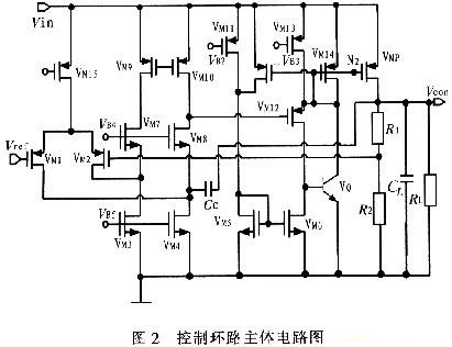 閉環(huán)控制系統(tǒng)的主體電路如圖2所示,VM1~VM8組成折疊式的誤差放大器,VM9~VM10組成單級(jí)的電流鏡作為負(fù)載,這樣做的好處就是采用10 pF左右的補(bǔ)償電容就可以使系統(tǒng)達(dá)到穩(wěn)定。VM5~VM14和VQ組成級(jí)間緩沖級(jí)。R1和R2組成反饋網(wǎng)絡(luò),其中