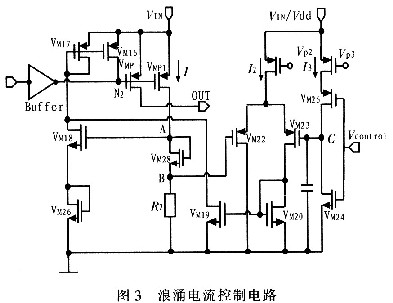由上面分析可知,由于N2節(jié)點(diǎn)電壓迅速變化,導(dǎo)致大的浪涌電流流過P功率管(VMP管)。因此只需要控制N2節(jié)點(diǎn)電壓的變化就可以實(shí)現(xiàn)電流的控制,控制該浪涌電流變化無非就是控制其變化的斜率和峰值。其具體的電路原理圖包括兩個(gè)部分,即浪涌電流的斜率控制部分和峰值控制部分。具體的實(shí)現(xiàn)電路如圖3所示。