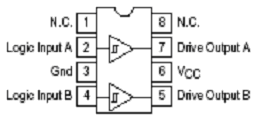MC34152的外圍電路簡單,應用方便。它是8管腳的同相推挽驅動芯片,具體的內部結構和封裝如圖4所示。2,4腳為兩路控制信號輸入,經過芯片內部的推挽放大,直接輸出同相的兩路驅動信號(7,5腳)。為使芯片更加穩定地工作,一般在芯片的電源端并聯一個濾去高頻干擾的瓷片電容和一個濾去低頻干擾的電解電容。