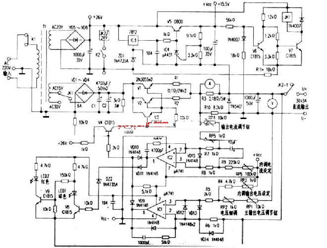 運放IC1(μA741)及周邊元件組成穩壓調節電路,由V1//V2、V3組成達林頓大功率電壓調整電路。RPl、RP2、RP3、R4、R5、R6、VDl2、VD13、VDl4等組成輸出電壓取樣電路,運放IC1對輸出電壓變化進行放大,由輸出端⑥腳經VD10對達林頓管的基極電流進行分流,以達到穩壓調整目的,其中RP1、RP2為面板上的輸出電壓粗細調節電位器,RP3為電路板內部的最高輸出電壓設定可調電阻。