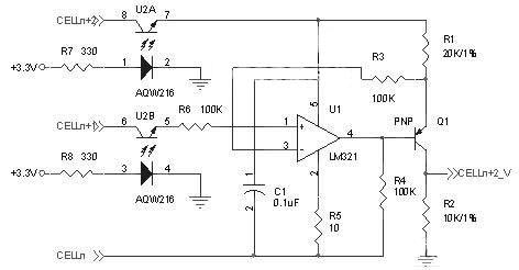 由于本文實驗中采用的采樣電路參考電壓為2.5V,因此需要把電池電壓進行2倍衰減,所以選擇了R1=2R2,電路中電容C1為去耦電容,電阻R5為限流電阻,電阻R4用于保證電路可靠工作,為了減少電壓檢測電路的漏電流,在每節單體電池電壓檢測線上加入AQW216光電繼電器作為檢測控制開關,如圖2所示,當需要檢測電池電壓時,通過控制端打開光電繼電器,檢測完關閉光電繼電器,可有效減少檢測時的漏電流對電池組一致性的影響。