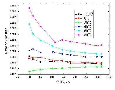 (2) 電壓檢測電路的誤差。電壓檢測電路中的誤差主要來自于電阻對的偏差以及三極管的偏差。對電壓檢測電路在不同溫度下的放大倍數進行了實驗,結果如圖4所示。