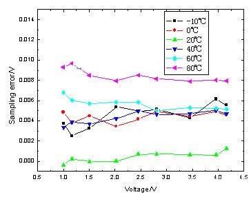 光電繼電器部分的檢測誤差不僅隨著溫度變化,同時也隨著被測量的電壓值變化,從圖3中可以看到,同一測量溫度下,1V與4V的被測量電壓之間的測量誤差達到12mV。從圖5中可以看到,而采樣系統的誤差僅僅同溫度有關,而與被測量電壓值無關。