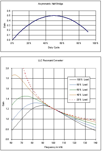 圖2:非對稱半橋和LLC轉換器的增益曲線