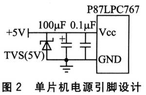 單片機(jī)工作電源和系統(tǒng)其他電路電源分開(kāi)設(shè)計(jì),避免其他電路對(duì)單片機(jī)工作電源產(chǎn)生影響,單片機(jī)工作電源設(shè)計(jì)留有足夠的余量,防止電源的波動(dòng)影響單片機(jī)工作。在設(shè)計(jì)PCB板時(shí),在單片機(jī)電源引腳接電容和瞬態(tài)電壓抑制器(TVS),如圖2所示。100 μF電解電容存儲(chǔ)的能量在電源波動(dòng)時(shí)(降低)釋放出來(lái),保持電源穩(wěn)定;0.1μF的高頻電容可以吸收電源上的高頻干擾;TVS吸收瞬態(tài)浪涌功率,使兩極間的電壓箝位于一個(gè)預(yù)定值,保持單片機(jī)工作電源穩(wěn)定。