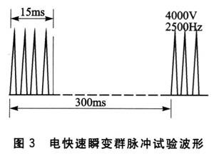 由于閃電、接地故障或切換電感性設(shè)備而引起的信號(hào)參數(shù)產(chǎn)生瞬時(shí)擾動(dòng),產(chǎn)生的高頻干擾信號(hào)主要是通過(guò)系統(tǒng)進(jìn)線(xiàn)電源進(jìn)入系統(tǒng)內(nèi)部。檢測(cè)這方面的抗干擾能力,主要是通過(guò)“電快速瞬變脈沖群抗擾度試驗(yàn)”驗(yàn)證。根據(jù)低壓電器產(chǎn)品試驗(yàn)標(biāo)準(zhǔn)要求,試驗(yàn)時(shí)在供電輸入端疊加頻率為2 500 Hz,幅度4 000 V的群脈沖,分別進(jìn)行相線(xiàn)、地線(xiàn)的差模、共模,正極性、負(fù)極性試驗(yàn),每項(xiàng)試驗(yàn)時(shí)間均為1 min,群脈沖的波形如圖3所示。如果在“電快速瞬變脈沖群抗擾度試驗(yàn)”過(guò)程中保護(hù)器不產(chǎn)生誤動(dòng)作,則這方面的抗干擾能力就是合格的。