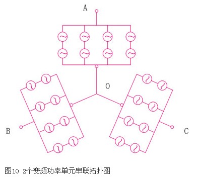 圖10所示的是1/4全電壓等級3.3kv的拓?fù)鋱D:由2個(gè)變頻功率單元串聯(lián)組成1個(gè)變流鏈,每相由4個(gè)變流鏈相并聯(lián),實(shí)現(xiàn)3.3kv等級的三相交流恒功率5000kva輸出。
