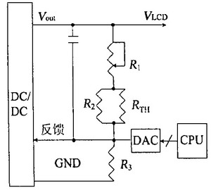 液晶顯示器對比度的調節可分為硬件調節和軟件調節。圖5的電路具有軟、硬件調節功能。其中R1是可調電阻,可調節VLCD的電壓,從而液晶顯示器的對比度得到調節;電路中還可利用CPU與數模轉換器(DAC)相結合來控制DC/DC的反饋端的電壓,從而實現軟件調節液晶顯示器的對比度。