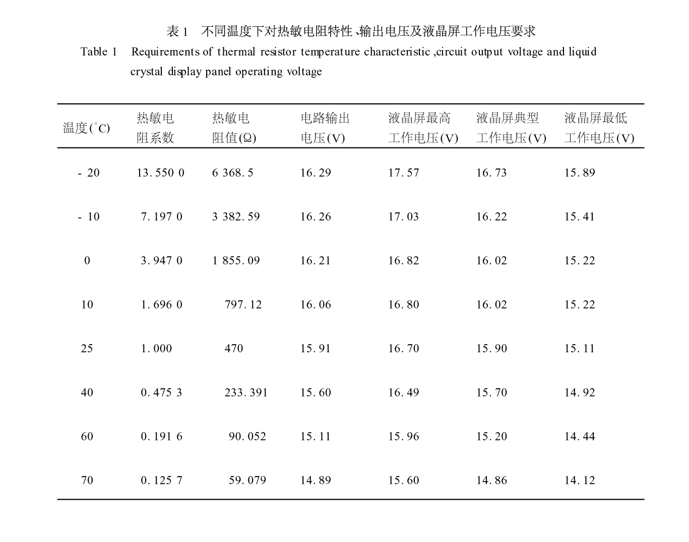 進行了模擬計算,結果如表1,由表1所得曲線如圖4。表1和圖4表明電路輸出和液晶屏的要求吻合,電路能夠保證液晶在-20~70°C 范圍內正常顯示。而且高、低溫測試結果證實,在-20~70 °C范圍內對比度正常。