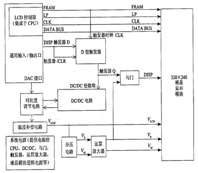 實現液晶顯示須具備4個單元,其框圖如圖1所示。本文給出的電源管理電路設計方案具有驅動電壓產生、時序控制、溫度補償和對比度調節的功能,其框圖如圖2所示。