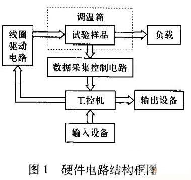 電磁繼電器壽命加速試驗(yàn)裝置包括試驗(yàn)控制柜、負(fù)載、自動(dòng)調(diào)溫箱(提供加速應(yīng)力)3部分,其中控制柜由工控機(jī)、數(shù)據(jù)采集控制電路、線圈驅(qū)動(dòng)電路組成,是設(shè)計(jì)的主要內(nèi)容。硬件電路結(jié)構(gòu)框圖 如圖1所示。