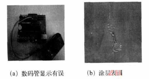 發(fā)現(xiàn)涂層有明顯的裂痕,數(shù)碼管的第二個數(shù)字“2”顯示有問題,如圖3 所示。