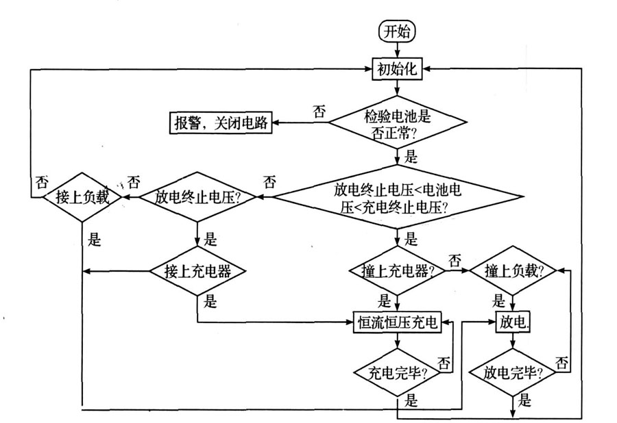 程序開始執行后, 首先進行初始化并檢測電池電壓、電流、溫度等信息是否正常。 如正常則進入下一步。 否則報警并關閉電路。 如果電池電壓在充電終止電壓和放電終止電壓之間, 說明電池既可充電也可放電。 此時電路將判斷接上充電機還是接上負載。 以進行相應的充電和放電。 如果兩者都沒有接則循環檢測過程。 若電池電壓已經到達充電終止電壓。 則等待負載的接入進行放電;同樣若電池電壓己經達到放電終止電壓,則等待充電器的接入以進行充電。 在整個過程中,該電路將始終實時檢測電池信息,若有異常情況發生,則立即利用中斷信號終止正在進行的充電或者放電過程,關斷充放電回路,同時進行報警并提示報警原因。