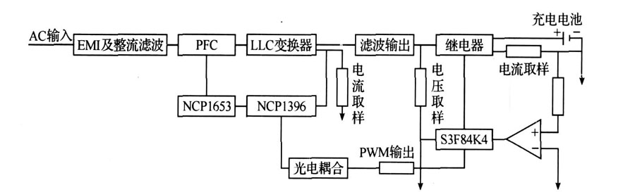 交流電經過濾波整流后,流向NCP1653,由其提供PFC(Power Factor Correction) 操作,NCP1653是一款連續導通型(CCM) 的功率因數校正( PFC) 升壓式的上升控制電路, 它的外圍元器件數量很少,有效地減少了升壓電感的體積, 減小了功率MOS管的電流應力,從而降低了成本,且極大地簡化了CCM 型的PFC 的操作,它還集成了高可靠的保護功能。 NCP1396 電路為整個硬件電路提供保護(包括有反饋環路失效偵測、快速與低速事件輸入,以及可以避免在低輸入電壓下工作的電源電壓過低偵測等) ,NCP1396 的獨特架構包括一個500 kHz 的壓控振蕩器,由于在諧振電路結構中避開諧振尖峰相當重要,因此為了將轉換器安排在正確的工作區,NCP1396 內置了可調整且精確的最低開關頻率,通過專有高電壓技術支持。 應用S3F84K4 單片機實現智能充電器控制。