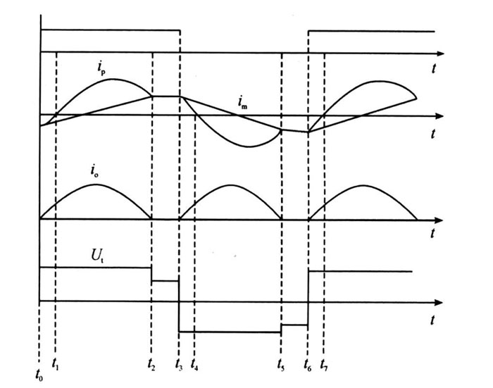 在下半個周期中, 電路的工作與上半個周期剛剛相似,只是方向相反。整個周期的電路工作波形:在上半個周期中,開關管Q1 為零電壓導通, 而Q1 在t3 時刻的關斷電流im 很?。?在下半個周期中,開關管Q2 為零電壓導通,而Q2 在t6 時刻的關斷電流im 很小,所以Q1 、Q2 工作時的開關損耗很小。